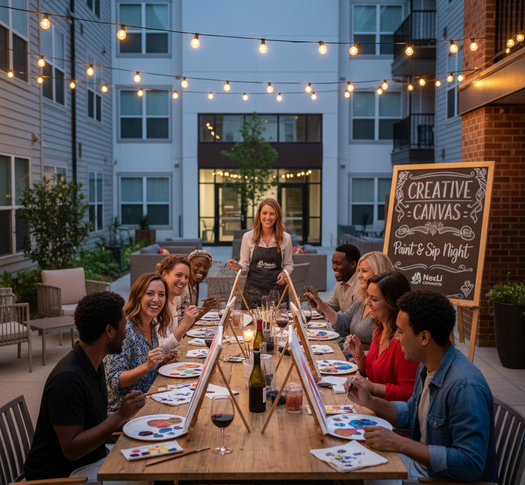 Group of people participating in a paint and sip night at a creative canvas event on an outdoor patio with string lights and a chalkboard sign.