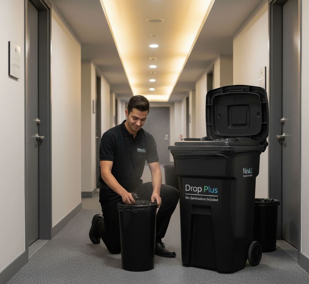 Upgrade your property's cleanliness with nightly doorstep pickup plus bin sanitization. NexLi Drop Plus keeps common areas fresh, residents happy, and your team free from trash duty.